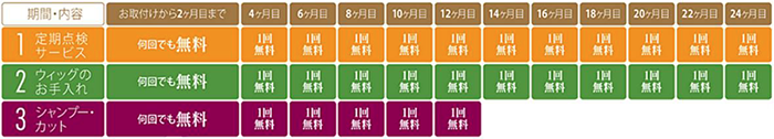 自髪のシャンプー・カットサービスは1年間無料(お取付けから2か月目までは何回でも無料、それ以降は2ヶ月に1回の頻度で無料)です。購入したウィッグのストッパー・髪質・ベースネット等の点検を行う「定期点検サービス」、ウィッグのシャンプー・セットなど、ウィッグを長持ちさせる基本のお手入れを行う「ウィッグのお手入れ」、お客様の髪質に合うケア剤で、自髪のシャンプーを行ったり、ウィッグに合わせて自髪のカットを行う「シャンプー・カット」など、トータルに対応します。