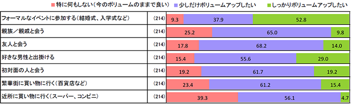 一方、「親族/親戚と会う」、「友人と会う」、「繁華街に買い物に行く」などのカジュアルなシーンでは、「少しだけボリュームアップしたい」と考える方が6割以上を占めました。“特別な日”や“日常使い”など、シーンによって髪のボリュームの度合いを変えたいと考える女性の意識が窺えます。
