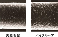 「バイタルヘア」は、洗髪や雨などの湿度の変化に合わせて、毛髪の質感やコシが天然毛髪同様に変化します。熱にもしっかり反応するので、ドライヤーでのヘアアレンジも自由にでき、自分の髪のようにスタイリングを楽しめます。表面にはキューティクル状の凹凸があり、光の反射から手触りまで、天然毛髪に近い自然さを実現しています。天然毛髪よりも切れにくく、色も変わりにくいため、あらゆるシーンでベストコンディションを保つことができます。