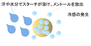 清涼成分で知られるメントールを、スターチ(澱粉)で包んでカプセルにした、メントールカプセルを採用しています。汗や水分でスターチが溶け、徐々にカプセルの中のメントールが放出されることで、心地よい清涼感を長続きさせます。リニューアルに伴い、メントールカプセルの配合量を20%増量することで、30分以上(自社調べ)の冷感持続は維持しつつ、冷感効果をさらに高めました。また、冷却作用とリフレッシュ効果のあるセイヨウハッカ葉エキスを追加しました。