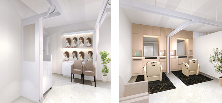 今回、大分大学医学部附属病院にオープンする店舗は、清潔感あふれる開放的な空間にプライベートに配慮した施術スペース2席を設けています。エントランスには、手に取って試着していただけるよう、様々なヘアスタイルのウィッグをディスプレイしています。また、店内はバリアフリーを実現し、点滴スタンドや車椅子での来店が可能です。病室までお伺いする出張カットにも対応するため、ご自身での来店が困難な患者さまでもサービスをお受けいただけます。