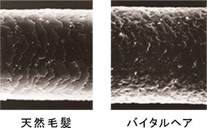 「バイタルヘア」は、洗髪や雨などの湿度の変化に合わせて、毛髪の質感やコシが天然毛髪同様に変化します。熱にもしっかり反応するので、ドライヤーでのヘアアレンジも自由にでき、自分の髪のようにスタイリングを楽しめます。表面にはキューティクル状の凹凸があり、光の反射から手触りまで、天然毛髪に近い自然さを実現しています。天然毛髪よりも切れにくく、色も変わりにくいため、あらゆるシーンでベストコンディションを保つことができます。