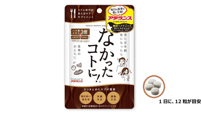 「なかったコトに!」は、食べたい気持ちをサポートするカロリーバランスサプリメントで、これまでに376万個※を販売している商品です。白インゲン豆、サラシア、ハス葉エキス、α-リポ酸、L-オルニチンなどのダイエットをサポートする成分を配合しています。『なかったコトに!アデランスコラボ』では、カロリーバランスサポートに加え、ヘアケアサポートとしてケラチンや大豆イソフラボン、亜鉛、ビタミンB2などをバランスよく配合しました。