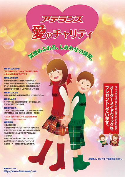 「お子さまの髪の悩みを心の傷にしないために」をテーマに、病気やケガなどの理由でウィッグを必要とされるお子さま(4歳から15歳まで)へオーダーメイド・ウィッグを製作してプレゼントする「愛のチャリティ」を、1978年から35年以上継続して実施しています。