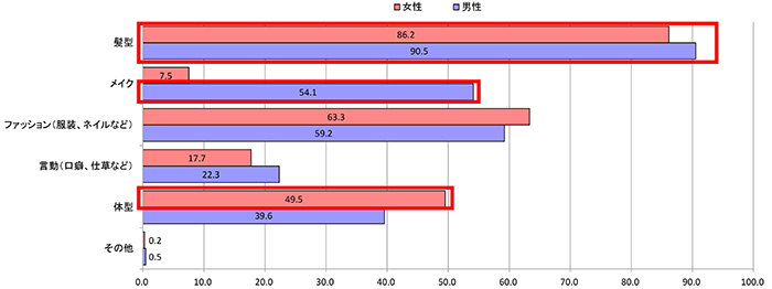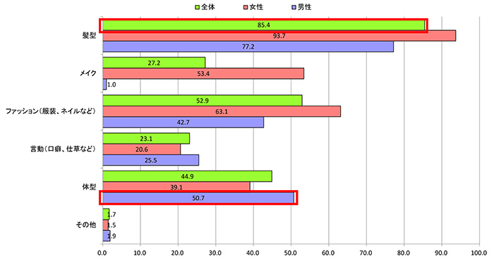 イメージチェンジをするとしたら、どこを変えるか尋ねたところ、男女共に「髪型」(85.4%)と回答した人が最も多く、次に「ファッション(服装、ネイルなど)」(52.9%)、「体型」(44.9%)と続きました。男女別に見ると、男性は「髪型」(77.2%)に次いで「体型」(50.7%)との回答が多く、「ファッション」や「メイク」のポイントが高い女性に比べ、男性は「体型」を変えることによるイメージチェンジを図る傾向がみられます。