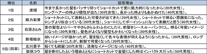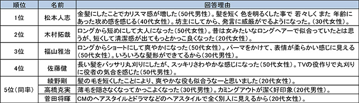 男性芸能人ではお笑い芸人の松本人志さんが1位となりました。2位にはSMAPの木村拓哉さん、3位には歌手で俳優の福山雅治さんが続きました。男女共に、髪を短くすることで魅力的になった人に支持が集まった結果となりました。