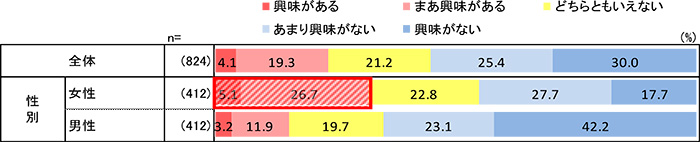 手軽にイメージチェンジができるウィッグへの興味について尋ねたところ、「興味がある」「まあ興味がある」と答えた人が、男性の15.1%に対し、女性は31.8%と2倍ほど高く、男性より女性のほうがイメージチェンジできるアイテムとしてウィッグに関心をもっていることが分かりました。