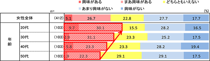 さらに女性を年齢別にみると、若い年代ほど「興味がある」・「まあ興味がある」と回答した人が多く、若い年代ほどウィッグに対して好意的な傾向が見られます。