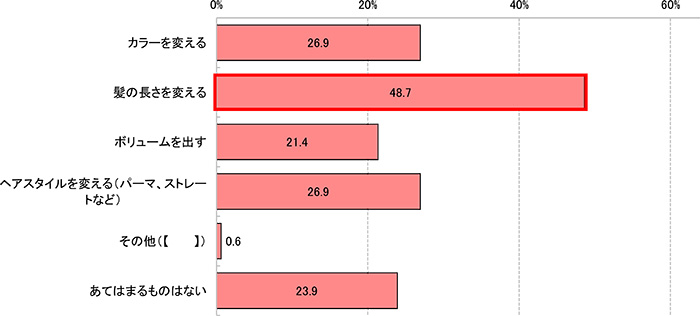 ウィッグを使ってどんなイメージチェンジをしたいかを尋ねたところ、「髪の長さを変える」が48.7%で最も多く、次に回答の多かった「カラーを変える」(26.9%)、「ヘアスタイルを変える」(26.9%)を大きく引き離しました。