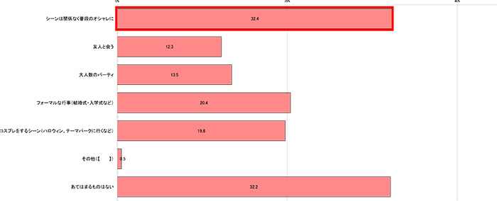 ウィッグを使ってイメージチェンジをするとしたら、どんなシーンで使いたいかを尋ねたところ、「シーンは関係なく普段のオシャレに」(32.4%)と答えた人が最も多く、次に「フォーマルな行事」(20.4%)と続きました。ウィッグを特別なシーンよりも、普段使いで使用したいと考えている人が多いことがわかりました。
