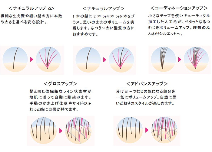 「ヘアアップα」は、自髪を活かしながら気になる部分を簡単にボリュームアップできます。増やし方の異なる5つのコースを組み合わせることで、お客様に合ったナチュラルなヘアスタイルをご提案します。