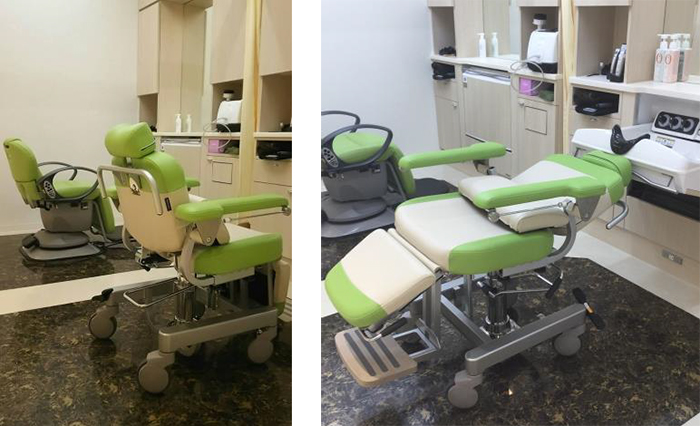 病院内ヘアサロンでは、バリアフリーにより車イスでの来店が可能なだけでなく、移動の困難な患者さまにもサービスを提供できるように、移動式の理美容イスを導入しています。座ったままヘアカットやシャンプー等のサービスをお受けいただけます。ご利用者の身体を優しくサポートするシート形状で、走行中やリクライニング、上下昇降時も安心です。