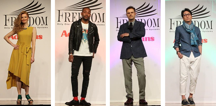 当日は、新増毛ヘアシステム「フリーダム」を施した4人のモデルがランウェイをウォーキングするショーからスタートし、ヘアシステムを施す前の写真が会場に映し出されると会場からは驚きの声が上がりました。その後、ヘアクラブ社のヴァイス・プレジデント セールス担当のメリッサ・オークス氏、リージョナル・ヴァイス・プレジデント イースト地区担当のアダム・ウォザースプーン氏が登壇し、北米の毛髪市場の現状や定額制ヘアシステムについて説明しました。