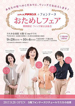 総合毛髪関連企業・株式会社アデランス(本社:東京都新宿区、代表取締役社長 津村 佳宏)は、女性用レディメイドウィッグ(既製品)ブランド「FONTAINE(フォンテーヌ)」やオーダーメイド・ウィッグ、医療用ウィッグ「ラフラ」などを取り扱う「フォンテーヌ クチュール ラスカ小田原」を、2017年9月28日(木)にオープンいたします。また、オープンを記念し、9月28日(木)~10月4日(水)までの間、入場無料のウィッグ展示試着会を開催します。