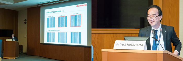 11月1日に開催されたもう一つのセミナーであるスポンサードセミナーは、「ウィッグ サービス イン ジャパン」として乾教授によるウィッグ使用におけるQOLの向上についての演題と、アデランス研究開発部長の平原裕治執行役員も演者として登壇し、当社オリジナル技術である人工毛髪サイバーヘア、バイタルヘアの先進性についての発表がおこなわれました。
