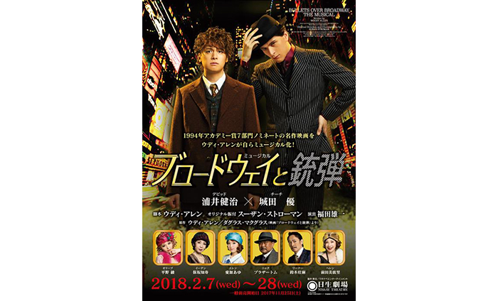 1994年公開の映画「ブロードウェイと銃弾」は、アカデミー賞助演男優賞、監督賞、脚本賞など7部門にノミネートされ、ウディ・アレン作品の中でも“傑作”の呼び声が高い。それを自らミュージカル化して2014年にブロードウェイで上演されたのが本作だ。ブロードウェイらしい陽気な笑いとソング&ダンスがたっぷり盛り込まれていて、音楽は20~30年代の禁酒法時代の曲をアレンジした軽快でアップテンポなものが多く、耳なじみが良い楽曲揃い。ブロードウェイでは連日スタンディング・オベーションの喝采で大きく盛り上がったこの作品が今回、浦井健治と城田優のW主演で日本初上演が実現した。売れない劇作家とギャングの部下のボディーガード、初めは正反対の2人が、徐々にお互いを認め合い、凸凹タッグを組んで作品の成功を目指していく。明るくスタイリッシュなコメディ・ミュージカルをお楽しみに!!