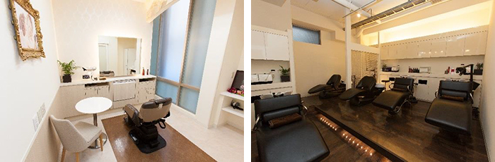 店内は、大人の女性が寛げる、シックで落ち着いた配色ながらも、自然光が降り注ぐ解放感溢れる空間です。また、プライベートな空間で施術を受けたいお客様のために、個室もご用意しており、一部のメニューを除いた施術を受けることができます。個室の利用は無料です(要予約)。