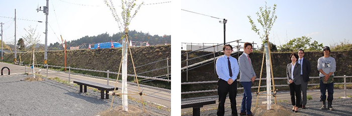 当社は2017年に続き、2018年も同団体を支援し、今年2月に当社からの支援金で石巻市給分高台移転地に、苗木よりも少し大きな桜の木2本とネームプレートが設置されました。給分地区は漁業が盛んな75世帯ほどの地区でしたが、震災後は50世帯となり、そのうち25世帯が高台移転地に転居しています。今回の植樹場所は、残念ながら転居せざるを得なかった住民の方々の希望で、津波到達地点ではなく、住民の方々が集う公園内となりました。これまでは津波到達地点への植樹がメインでしたが、住民の方々が前に進むための後押しになってほしいという願いから、公園や集会所など、普段から目に触れやすい場所に植樹されています。