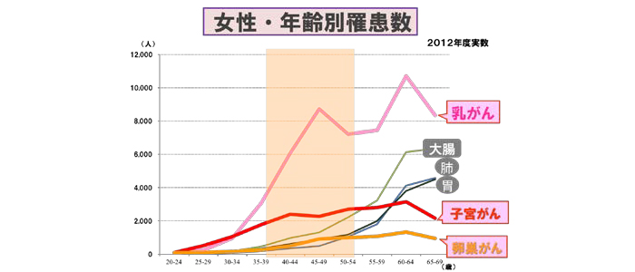 一般にがんは、高齢になるほど罹患リスクが高まると言われているが、日本の女性の場合、30代後半から乳がん・子宮がんに罹患するケースが多い。