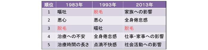 抗がん剤治療による副作用の苦痛が、1980-90年代は、身体的苦痛で占められていたのに対し、近年2010年代の調査では、自身を取り巻く関係性に影響を与えることを苦痛と感じるようになっている。