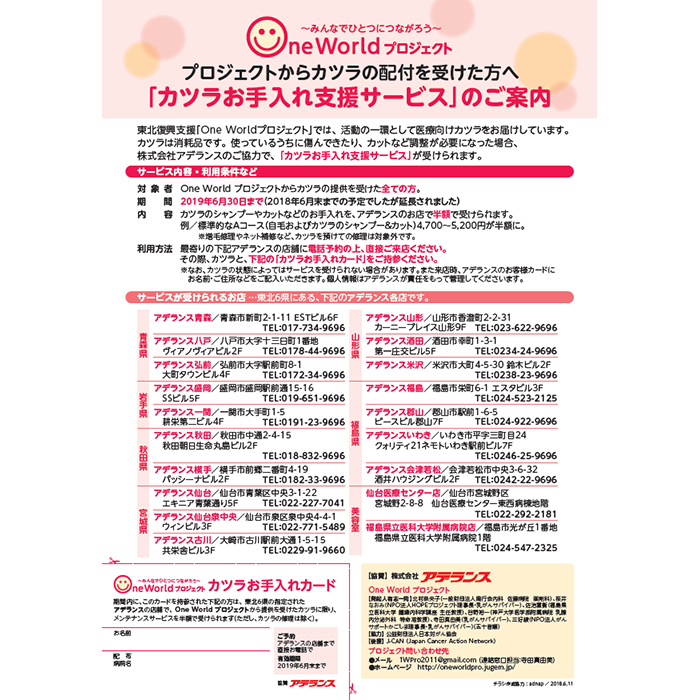 本サービスは、東日本大震災で被災されたがん患者様に医療向けウィッグなどのケア用品を届ける支援団体「One Worldプロジェクト」*様に賛同したもので、同団体が提供したウィッグを対象に、シャンプーやヘアカットなどのお手入れを通常価格の半額で行います。CSR活動の一環として、当初は、病院内ヘアサロン店舗を含む16店舗の対応でスタートしました。その後、2013年に「福島県立医科大学附属病院店」、2014年に「アデランス横手」、2017年に「アデランス仙台泉中央」でもサービス提供を開始しました。今回の延長後もこれまでと同様に、東北6県の全19店舗でサービスを提供いたします。