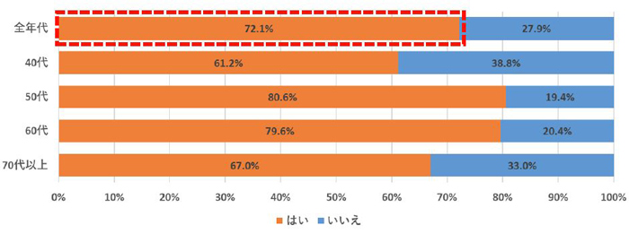 現在白髪染めを行っているか尋ねたところ、全体で72.1%、50代・60代では約8割の人が白髪染めを行っていると回答しました。