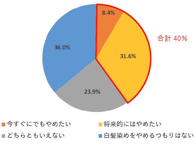 白髪染めを行っている人に、白髪染めをやめたいと思うか尋ねたところ、4割の人が白髪染めをやめたい(「今すぐにやめたい」「将来的にはやめたい」計)と回答しました。