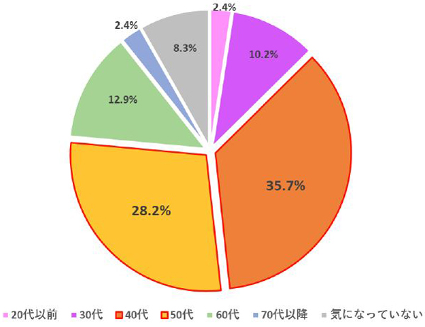 いつ頃から白髪が気になり始めたのかを尋ねたところ、「40代」(35.7%)と回答した人が最も多く、次が「50代」(28.2%)でした。40代と50代で6割以上(63.9%)を占めており、白髪が最も気になる年代が40代・50代であることが伺えます。