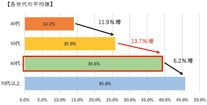 自身の白髪度合いを、パーセンテージで表現してもらったところ、50代では平均25.9%であったのに対し、60代では39.6%と大きく増加(13.7%増)しました。また、60代・70代では平均値が約4~5割となっており、自身の髪の約半分が白髪であると感じていることが伺えます。