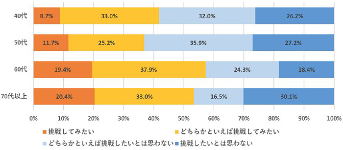 グレイヘアへの挑戦意向を尋ねたところ、約半数(47.3%)が「挑戦してみたい」「どちらかといえば挑戦してみたい」と回答しました。年代別では60代が最も高く、60代・70代ではどちらも半数を超える人がグレイヘアへ挑戦してみたいとの意向を示しました。