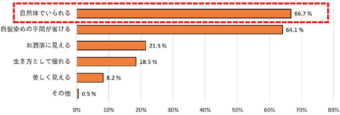 グレイヘアについて「挑戦してみたい」「どちらかといえば挑戦してみたい」と回答した人を対象に、その理由について尋ねたところ、「白髪染めの手間が省ける」(64.1%)を抜いて、「自然体でいられる」(66.7%)がトップとなりました。白髪染めの手間が省けるという効率化の側面よりも、着飾らず、ありのままの自然な自分でいられるところにグレイヘアの魅力を感じている人が多いことがわかります。
