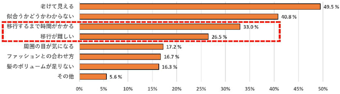 一方、「移行するまで時間がかかる」や「移行が難しい」と答えた人も多く、綺麗なグレイヘアになるまでの「移行期間」にハードルを感じている人が多いことが分かります。