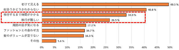 一方、「移行するまで時間がかかる」や「移行が難しい」と答えた人も多く、綺麗なグレイヘアになるまでの「移行期間」にハードルを感じている人が多いことが分かります。