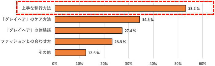 グレイヘアについて知りたい情報を尋ねたところ、半数以上の人が「上手な移行方法」について知りたいと回答しました。前問の結果でも「移行期間」にハードルを感じている傾向がみられましたが、同じく移行期間の過ごし方への関心度が高いことが分かります。