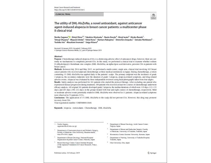 (乳癌患者における抗癌剤誘発脱毛に対する新規抗酸化剤DHL-HisZnNa(αリポ酸誘導体)の有用性–多施設第Ⅱ相臨床試験-)