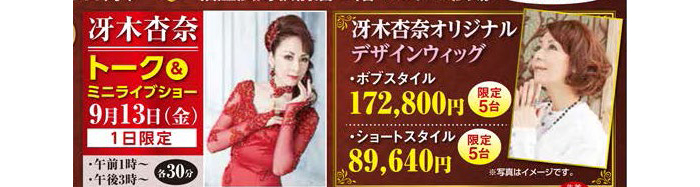 毛髪・美容・健康のウェルネス産業の株式会社アデランス(本社:東京都新宿区、代表取締役社長 津村 佳宏)は、2019年9月12日(木)に福屋八丁堀本店にて、9月13日(金)に福屋広島駅前店 (ともに広島県広島市)にて、世界的なタンゴ歌手・女優の冴木杏奈さんをお招きしたトーク&ミニライブショーを開催いたします。また、冴木杏奈さんによるオリジナルデザインウィッグを数量限定で販売します。アデランスでは「輝く女性を応援する」一環として2010年よりウィッグを通じて冴木さんの活動をサポートしています。コンサートはもとより、舞台、ドラマなど様々な場面で当社のウィッグをご愛用いただいています。