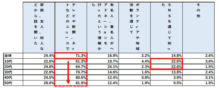 年代が上がるほどマスメディアのニュースから情報を得ている傾向にある一方、10代20代の若年層は、他の年代よりもSNSを通じて知ったという割合が高くなっています。