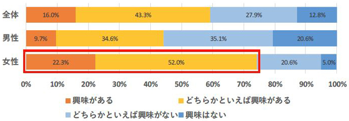 ヘアドネーションに興味があるか尋ねたところ、約6割の人が「興味がある」(16.0%)「どちらかといえば興味がある」(43.3%)と回答しました。男女別にみると、認知度の質問同様、女性の方が高い関心を示しており、74.3%の人が「興味がある」「どちらかといえば興味がある」と回答し、男性の44.3%に比べると30%も高い結果となりました。