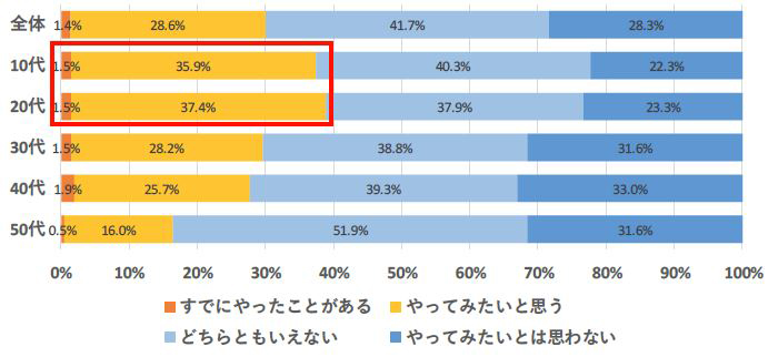 年齢別にみると、10代20代の若年層は4割弱の人が実際にやってみたいと思っており、ヘアドネーションへの実施意向が他の年代と比べて高いことがわかりました。