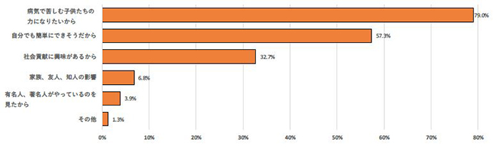 前問で「すでにやったことがある」「やってみたい」と答えた方に対し、なぜやってみたいと思ったのかを尋ねたところ、約8割の人が「病気で苦しむ子供たちの力になりたいから」と回答し、「自分にも簡単にできそうだから」(57.3%)、「社会貢献に興味があるから」(32.7%)の順に続きました。