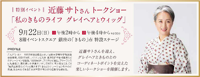 | 内容 | 「私のきものライフ グレイヘアとウィッグ」 近藤サトさんを迎え、グレイヘアときものとのコーディネートポイントを交えた楽しいトークショーを開催します。 |