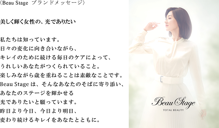 凰稀さんは2015年に宝塚歌劇団を退団されて以降、舞台、テレビ、ライブなど新たなステージで活躍され、益々輝き続けていらっしゃいます。その輝きは、「日々の変化に向き合う、あなたのステージを輝かせる光でありたい」をブランドメッセージとする「BeauStage」ブランドを体現するものであることから、この度のブランドアンバサダー起用となりました。日々の変化に向き合い頑張る大人の女性に向けて、凰稀さんと共に「BeauStage」は光となって応援していきます。