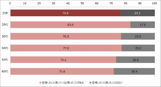 最も少ない60代でも7割(71.6%)の人が「変身したいと思っている/思ったことがある」と回答しており、世代を問わず、日本男性の“メタモルフォーゼ願望”は強いようです。日本人男性の75.9%が普段とは違う自分に“変身”したいと思ったこと(思うこと)があると回答しています。