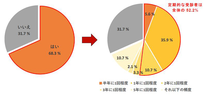 乳がん罹患前に、乳がん検診を受けたことがあるか尋ねたところ、68.3%と約7割の人が受けたことがあると回答した一方で、約3割の人が検診を受けていなかったことがわかりました。 また、「はい」と回答した7割の人へ、どのくらいの頻度で受けていたか尋ねたところ、定期的(2年に1回※1以上の頻度)に検診を受けていた人は52.2%となり、全体の約半数という結果になりました。