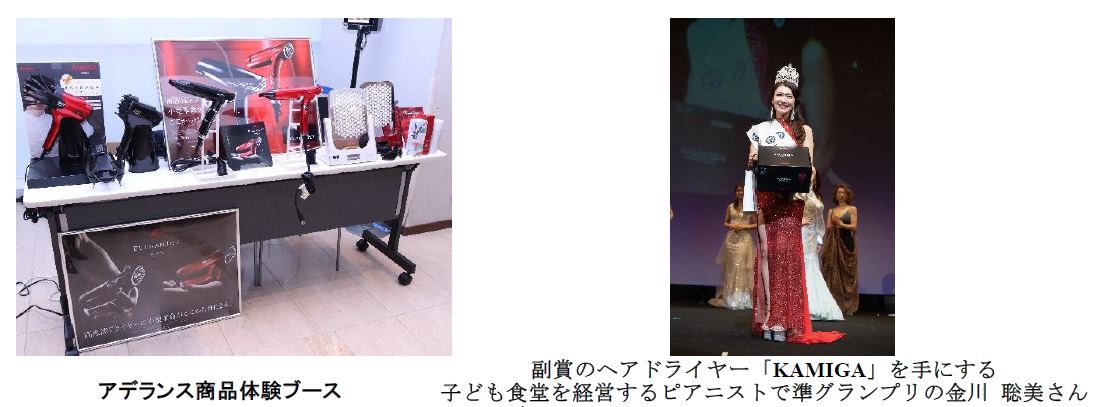 当社は、本大会の多様性やSDGs・社会貢献に対する取り組みに共感し、当社代表取締役社長の津村 佳宏が審査員を務め、アデランスの商品を提供しました。美と健康に関心が高いファイナリストの方に、当社の先端美容を体験いただくため、美と健康のトータルビューティブランド「BeauStage(ビューステージ)」商品の体験ブースも設置しました。6月1日に新発売した高性能小型折り畳み式ヘアドライヤー『BeauStage ELEGANJET(ビューステージ エレガンジェット)』や LED 美容照射パネル『BeauStage VIRUGA(ビューステージ ビルガ)』などを体験いただきました。