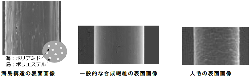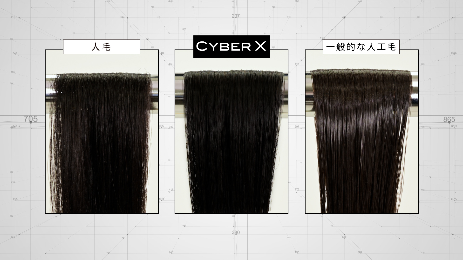 「サイバーエックス」は、繊維学の世界的権威で当社の学術顧問、東京工業大学 物質理工学院の鞠谷 雄士特任教授と共同研究の下、約15年間の研究期間を経て開発した機能性人工毛です。特許取得のツヤ消し技術(特許第5518857号)を採用し、ポリアミドとポリエステルからなる海島(うみしま)構造に仕上げることで、天然毛髪に近いツヤ感を再現しています。この技術は、2017年に開催された第14回アジア繊維会議において人工毛髪の表面粗面化による外観改良が評価され「テキスタイル材料分野における最優秀論文賞」を受賞した技術を応用して開発しました。