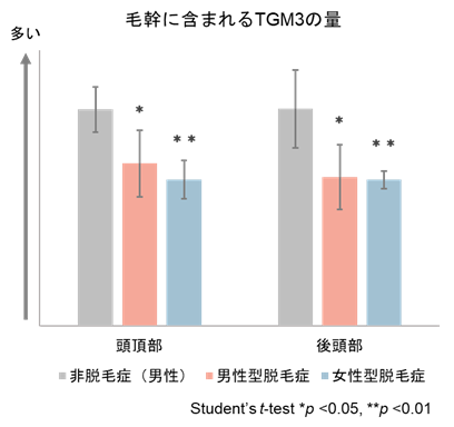 脱毛症の毛幹において、毛髪形成に重要なタンパク質TGM3が少なかった。