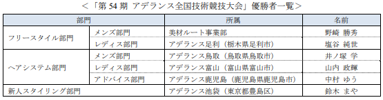 応募資格:株式会社アデランスに在籍し、アデランス、レディスアデランスのサロン、医療事業部、美材ルート事業部、国内の営業統括部(展示会担当)、東アジアエリア部で勤務する理容師または美容師の資格を有する者。