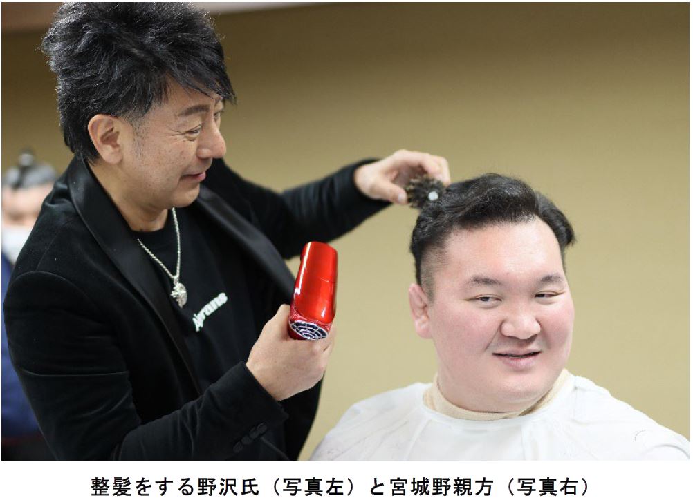 野沢氏は“似合わせの達人”とも称されるトップヘアスタイリストで、2015年より当社レディメイド・ウィッグ(既製品)ブランド「フォンテーヌ」の専属ヘアプロデューサーとして活動しています。今回は事務局よりご相談をいただき、断髪式後の宮城野親方のヘアカットとセットを野沢氏が担当しました。野沢氏は“若い方にも相撲に興味を持っていただき人気を高めていきたい”という宮城野親方のリクエストに応え、おしゃれで若い方に親しみを持って頂ける少しトレンド感を取り入れたヘアスタイルに仕上げました。