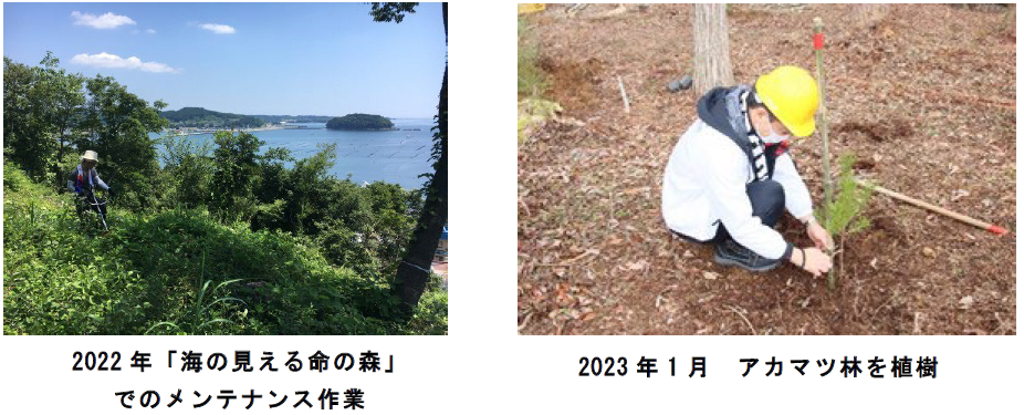 2019年より支援を開始したNPO法人さくら並木ネットワークは、2011年の東日本大震災の経験から“大津波の到達地に、桜を植樹したい”という東北の方々の強い想いと、花に携わる有志によって桜の成木を植樹する活動をしています。その想いに共感し、当社の東北営業部が中心となり植樹をしました。2022年からは「海の見える命の森」のメンテナンスに協力しています。また、新しく支援先として加わった「静岡県立森林公園」は、アカマツ林を主体とした自然の景観として県民に親しまれています。しかし、東日本大震災の影響で、松くい虫防除剤の空中散布用のヘリコプターが確保できず、松くい虫の被害が激増。こうした状況から当社では、「しずおか未来の森サポーター協定」を締結し、静岡県を管轄する当社の中京営業部が中心となり、アカマツ林再生プロジェクトに協力しています。2022年度は900平方メートルの土地に100本のアカマツの苗木を当社の中京営業部が中心となり植樹しました。